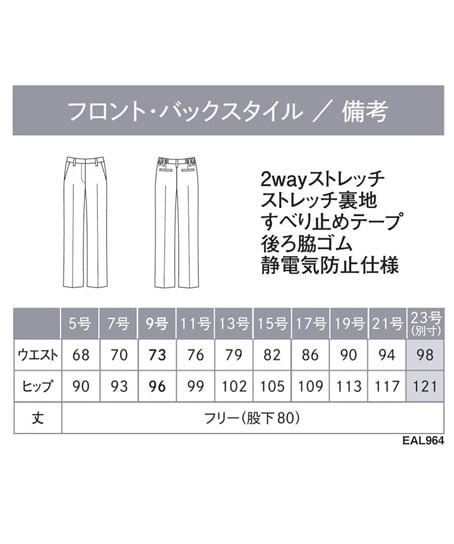 | ウエスト | 68 | 70 | 73 | 76 | 79 | 82 | 86 | 90 | 94 | 98 |