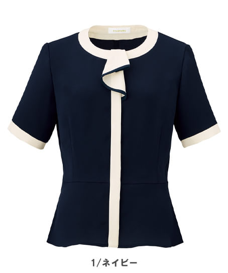 襟元のフリルとペプラムシルエットの甘さを、配色使いで引き締めて大人っぽく。やさしいアイボリーはスカートでもパンツでもエレガントに決まります。