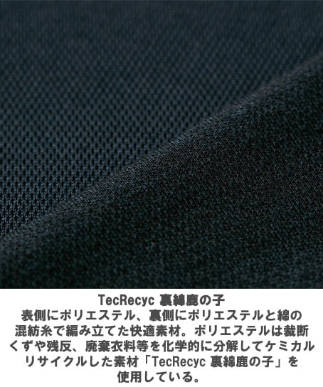 TecRecyc 裏綿鹿の子…表側にポリエステル、裏側にポリエステルと綿の混紡糸で編み立てた快適素材。ポリエステルは裁断くずや残反、廃棄衣料等を化学的に分解してケミカルリサイクルした素材「TecRecyc 裏綿鹿の子」を使用している。