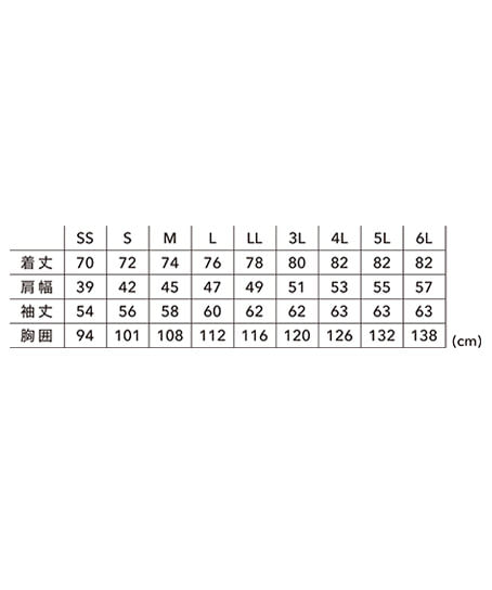 | 着丈 | 70 | 72 | 74 | 76 | 78 | 80 | 82 | 82 | 82 |